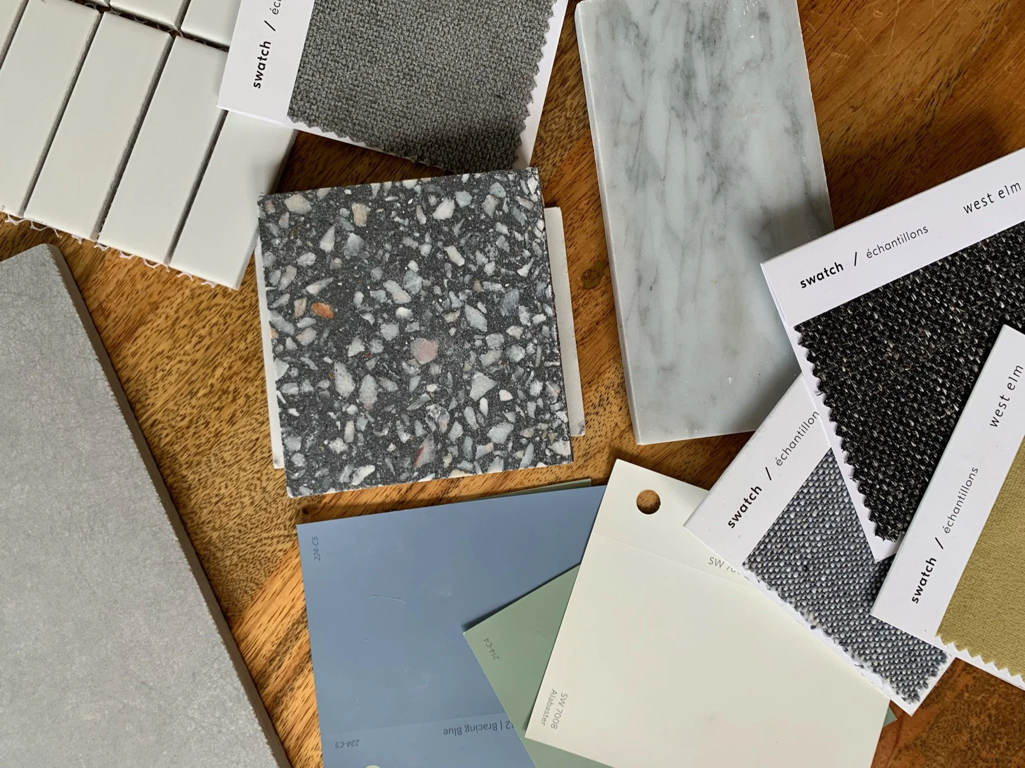 A collection of material and color samples displayed on a wooden surface, including fabric swatches, paint chips, tile samples, and a terrazzo tile.